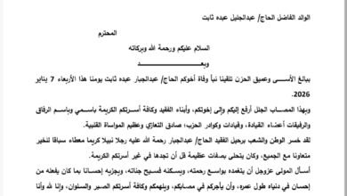 البعث نيوز- خاص بعث أمين عام حزب البعث العربي الاشتراكي- قُطر اليمن، الدكتور عبدالرحمن محمود المشرعي، برقية عزاء ومواساة إلى…