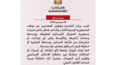 البعث نيوز ـ خاص أصدرت وزارة الخارجية وشؤون المغتربين اليمنية، اليوم السبت، بياناً أكدت فيه “الموقف الثابت” للجمهورية اليمنية والداعم…