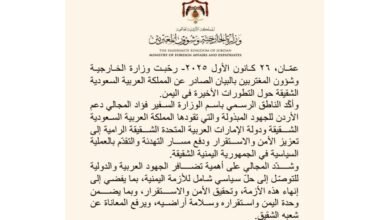 الأردن يُرحّب بالبيان السعودي حول اليمن ويؤكد دعمه للجهود العربية لإحلال السلام..