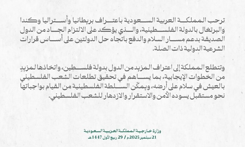 بيان سعودي بعد اعتراف 4 دول بـ”دولة فلسطينية”