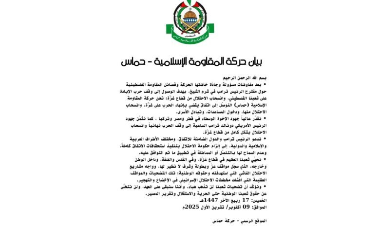 البعث نيوز _ متابعات أعلنت حركة المقاومة الإسلامية (حماس) في بيان رسمي صدر اليوم الخميس الموافق 9 أكتوبر/تشرين الأول 2025،…