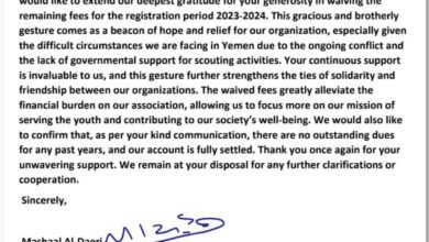 عدن ثمن مفوض عام جمعية الكشافة والمرشدات اليمنية القائد الكشفي مشعل الداعري، التعاون الكبير من قبل المنظمة الكشفية العالمية في…