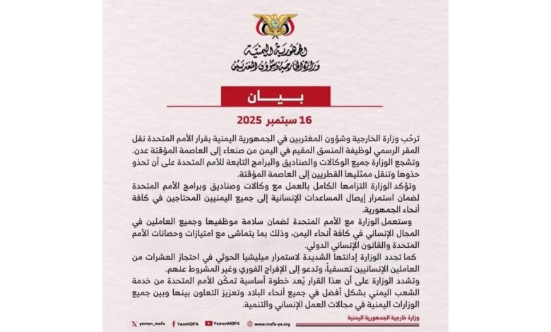 أكمل القراءة »البعث نيوز _ خاص أعلنت وزارة الخارجية وشؤون المغتربين في الجمهورية اليمنية، اليوم الثلاثاء، عن قرارها بنقل المقر الرسمي لوظيفة…