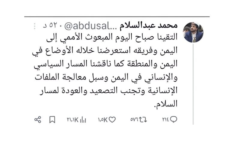 في مشهدٍ كوميدي رديء الإخراج، خرج علينا محمد السلام، مسؤول الملف الحوثي و”الناطق الرسمي للمشاورات” -هكذا يسمونه– بتغريدة منتفخة بالوهم، ليخبرنا أنهم “التقوا صباح اليوم بالمبعوث الأممي إلى اليمن وفريقه”، وناقشوا الأوضاع السياسية والإنسانية و”سبل تجنب التصعيد والعودة لمسار السلام”! بالله عليكم، من يصعد؟ من يزرع الألغام كأنها زهور في دروب الفقراء؟ من يقصف، يخطف، ينهب، ويمنع الرواتب؟