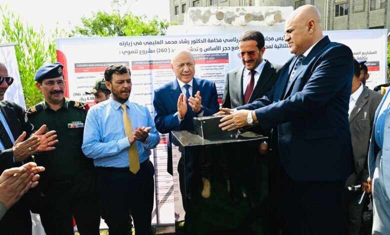 دشن رئيس مجلس القيادة الرئاسي الدكتور رشاد محمد العليمي، ومعه عضوا المجلس الدكتور عبدالله العليمي، والشيخ عثمان مجلي، ووضعوا حجر اساس اكثر من 260 مشروعاً تنموياً وخدمياً ممولة من الحكومة والسلطة المحلية، والوكالات، والمنظمات الدولية في محافظة تعز.