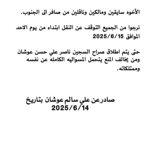 أصدر المدعو علي سالم عوشان في محافظة مأرب تحذير شديد اللهجة لكل سائقي قواطروناقلات مادة الغاز المنزلي المسال من التوجه إلي المحافظات الجنوبية بحسب بيان أصدره ووزعه علئ الاعلام