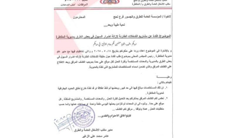 وفي تأكيد رسمي يعزز ما كشفه زين، حصل موقع “باب نيوز” على وثيقة رسمية صادرة عن مدير مكتب الأشغال العامة والطرق بمديرية المقاطرة، عامر محمد علي الزغير، تؤكد وجود تضخيم صارخ وتلاعب فاضح في المستخلصات المالية لمشاريع إزالة أضرار السيول بالمديرية.