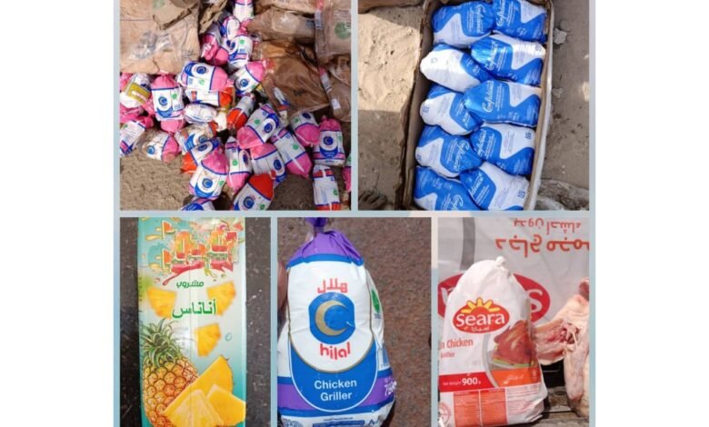 - 5055 كرتون دجاج مجمد (ماركتا “هلال” و”كونفدنس” برازيليتا المنشأ) بسبب فسادها نتيجة انخفاض التبريد، مما تسبب في نزيف اللحوم ونمو بكتيريا ضارة.