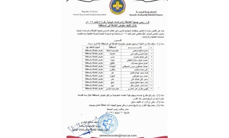 أصدر رئيس جمعية الكشافة والمرشدات اليمنية معالي وزير الشباب والرياضه نايف صالح البكري القرار رقم (1) لعام 2025 بشأن تكليف مفوضي الكشافة في المحافظات، وذلك في إطار تعزيز العمل الكشفي وتوسيع نشاط الجمعية على مستوى المحافظات.