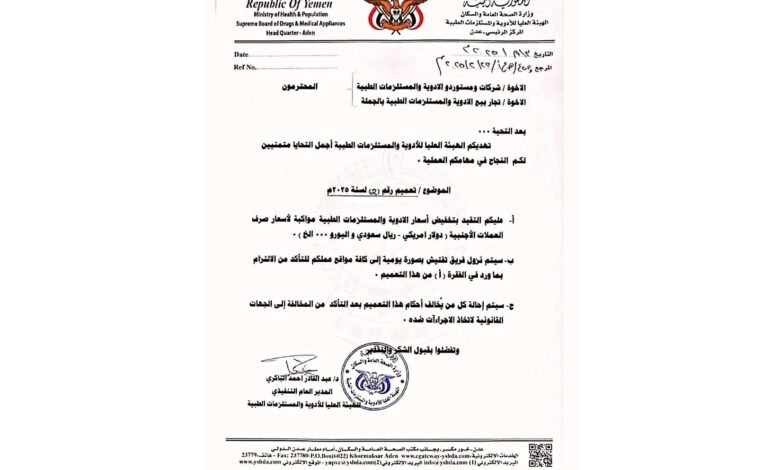 ويأتي هذا التعميم في إطار الجهود الحكومية لمواجهة الارتفاع غير المبرر في أسعار الأدوية، خاصة في ظل التقلبات الاقتصادية التي يشهدها اليمن.