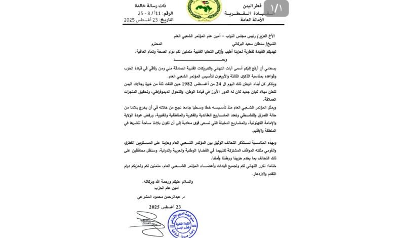 كما سلطت برقية التهنئة الضوء على “التحالف الوثيق بين المؤتمر الشعبي العام وحزب البعث العربي الاشتراكي على المستويين القطري والقومي”، والذي مثلته “المواقف المشتركة لكليهما في القضايا الوطنية والعربية والدولية”. وأكد المشرعي على “الحرص على دوام هذا التحالف واستمراريته بما يخدم الحزبين والوطن والأمة”.