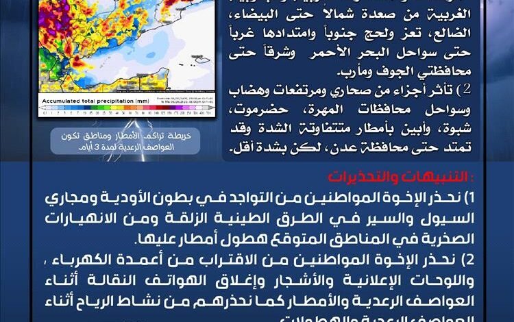 وجدد المركز، تحذيره للأخوة المواطنين في المناطق المتوقّع هطول أمطار عليها من التواجد في مجاري السيول والوديان، ومن العواصف الرعدية والرياح الشديدة المصاحبة لها، ومن الانزلاقات الصخرية .. مهيباً بهم اتخاذ الاحتياطات اللازمة لتجنب مخاطرها، كما جدد المركز، تحذيره للأخوة المواطنين في المناطق الصحراوية والساحلية من التعرض المباشر لأشعة الشمس خلال فترات طويلة .. مهيباً بالأخوة المواطنين في المناطق الساحلية بأخذ الاحتياطات اللازمة من الأجواء الرطبة.