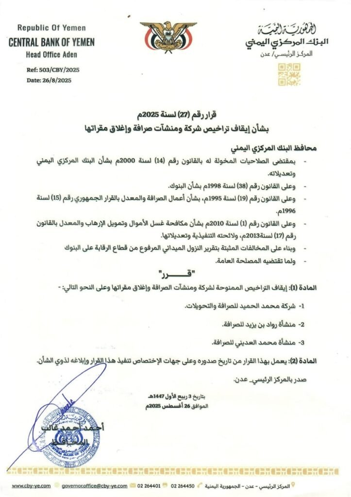 في العاصمة المؤقته بالمركز الرئيسي للبنك عدن قراراً تنظيمياً يقضي بإيقاف التراخيص وإغلاق مقرات ثلاث مؤسسات تعمل في مجال الصرافة والتحويلات، وذلك بسبب مخالفات ثَبُتَت وفقاً لتقارير الرقابة الميدانية.