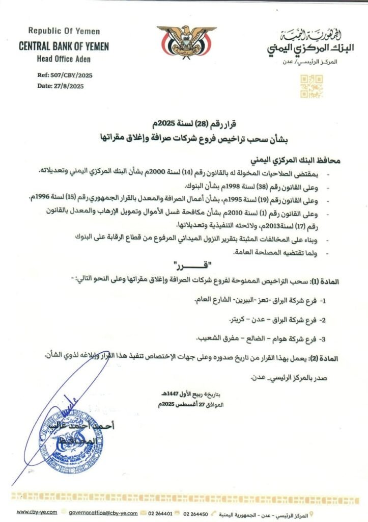 عدن، 27 أغسطس 2025 – أصدر البنك المركزي اليمني (فرع عدن) اليوم الخميس قراراً هاماً يقضي بسحب التراخيص الممنوحة لعدد من فروع شركات الصرافة العاملة في البلاد، وإغلاق مقراتها بشكل فوري.