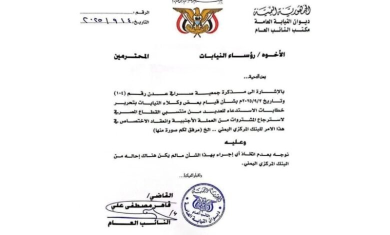 ونص التوجيه، الصادر بتاريخ 1 سبتمبر 2025، على “عدم اتخاذ أي إجراء بهذا الشأن مهما يكن، إلا في حال وجود إحالة رسمية من البنك المركزي اليمني”، مما يضع حداً لأي إجراءات فردية خارج الإطار القانوني المنظم.