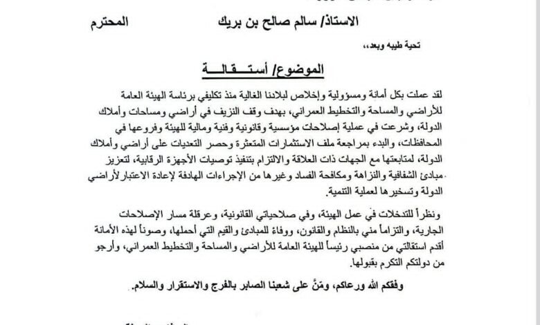 وجاء في خطاب الاستقالة أن العولقي عمل بكل أمانة ومسؤولية وإخلاص منذ تكليفه برئاسة الهيئة، وسعى لإيقاف النزيف في الأراضي والحد من العبث بها، من خلال إصلاحات مؤسسية وقانونية وفنية، وإصدار قرارات هدفت إلى حماية أراضي الدولة والحفاظ على حقوق المواطنين.