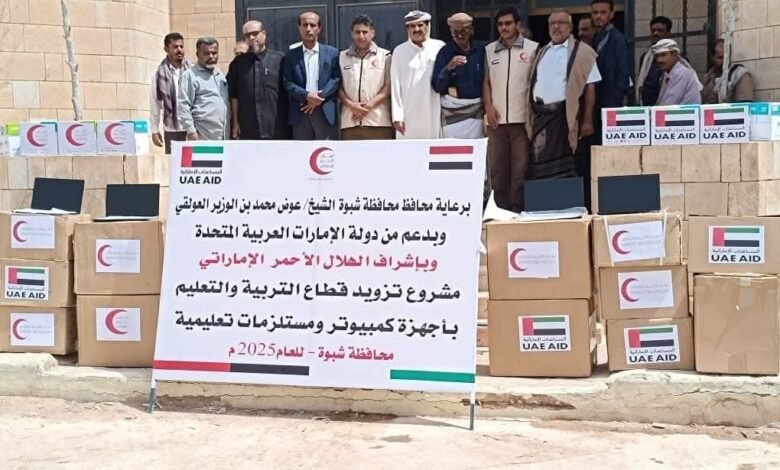 برعاية محافظ شبوة عوض بن الوزير، دُشن صباح الاثنين مشروع تزويد مدارس المحافظة بأجهزة كمبيوتر ومستلزمات تعليمية، بدعم من دولة الإمارات العربية المتحدة وتحت إشراف الهلال الأحمر الإماراتي.