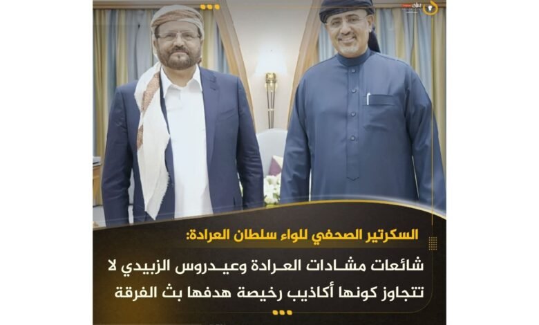 نفى السكرتير الصحفي للواء سلطان العرادة، عضو مجلس القيادة الرئاسي، بشكل قاطع ما تم تداوله على منصات التواصل الاجتماعي حول حصول مشادة كلامية بين الأخير وبين اللواء عيدروس الزبيدي، رئيس المجلس الانتقالي الجنوبي وعضو المجلس.