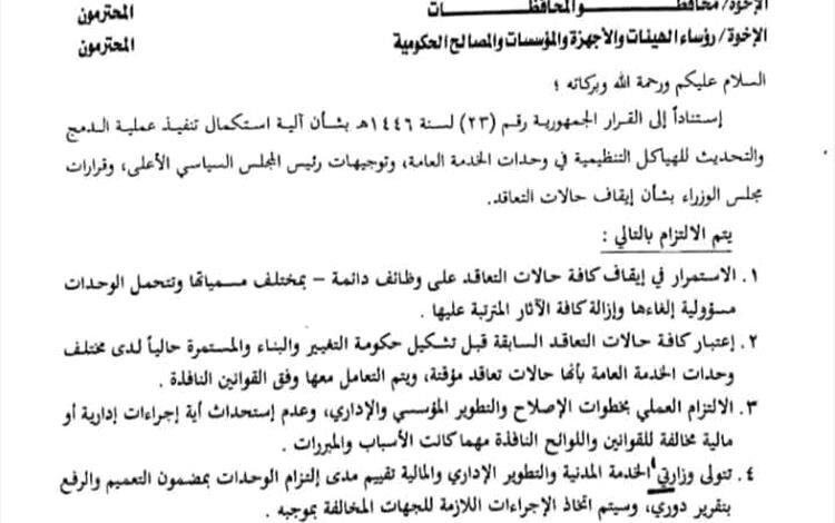 وبموجب هذا القرار، ستتم عملية الاستغناء عن عشرات الآلاف من المتعاقدين الذين قضوا سنوات طويلة في خدمة مؤسسات الدولة، معتمدين على رواتب زهيدة كمصدر رزق وحيد لهم ولأسرهم. ويخشى مراقبون أن يؤدي ذلك إلى تسريح جماعي كارثي يزيد من حجم المعاناة الاقتصادية والاجتماعية التي يعيشها اليمنيون في ظل الظروف الراهنة.