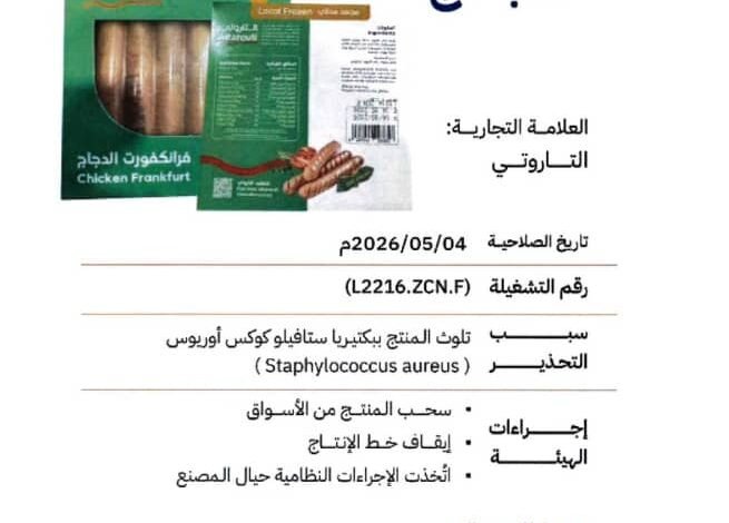 حذرت الهيئة اليمنية للمواصفات والمقاييس وضبط الجودة، من استخدام منتج فرانكفورت دجاج “ماركة التاروتي” ذات منشأ سعودي، وحظرت دخوله إلى البلاد ودعت إلى سحبه من الأسواق، بموجب التعميم الذي أصدرته اليوم الاثنين الموافق 22 سبتمبر 2025م، برقم (35) للعام 2025م، إلى كافة فروعها ومكاتبها بالمحافظات والمنافذ الجمركية، بشأن التحذيرات الصادرة عن الهيئة العامة للغذاء والدواء السعودية بخصوص سحب منتج فرانكفورت دجاج “ماركة التاروتي”، ذات المنشأ السعودي من الأسواق، بتاريخ انتاج 4/سبتمبر/2025م، رقم الدفعة (L2216.ZCN.F)، نتيجة لتلوث المنتج ببكتيريا (ستافيلوكوكس اوريوس)، لما له من مخاطر جسيمة تؤثر على صحة وسلامة الإنسان.