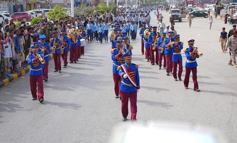 محافظة مأرب تحتفي بأعياد الثورة بمسيرة شبابية وكشفية بالموسيقى العسكرية
