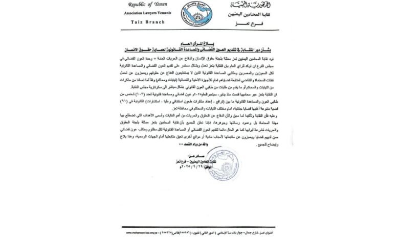 أكدت نقابة المحامين اليمنيين – فرع تعز، في بيان رسمي وجهته للرأي العام، استمرارها في تقديم خدمات العون القضائي والمساعدة القانونية مجاناً للمحتاجين والمعسرين، وذلك في إطار دورها النقابي والإنساني الهادف إلى حماية حقوق الإنسان وضمان الوصول إلى العدالة.