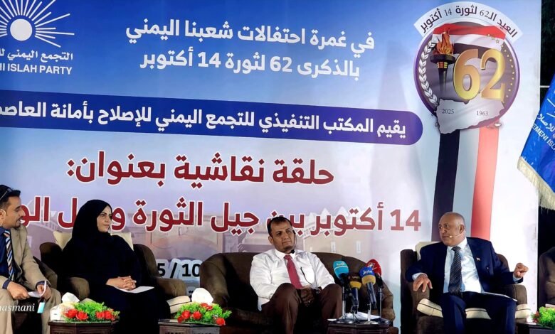 أقام المكتب التنفيذي للتجمع اليمني للإصلاح بأمانة العاصمة، حلقة نقاشية بمناسبة الذكرى الثانية والستين لثورة 14 أكتوبر المجيدة، تحت شعار “14 أكتوبر بين جيل الثورة وجيل الوحدة”،بمشاركة نخبة من المناضلين والأكاديميين والباحثين من داخل اليمن وخارجه.