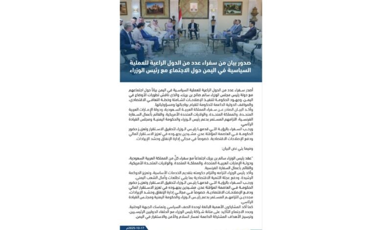وحث المشاركون في الاجتماع على “الوحدة السياسية وتماسك الجبهة الوطنية”، مع التأكيد على أهمية شراكة رئيس الوزراء مع “الشركاء الدوليين الرئيسيين” لتحقيق الأهداف المشتركة المتمثلة في “مسار السلم والأمن والاستقرار في اليمن”.