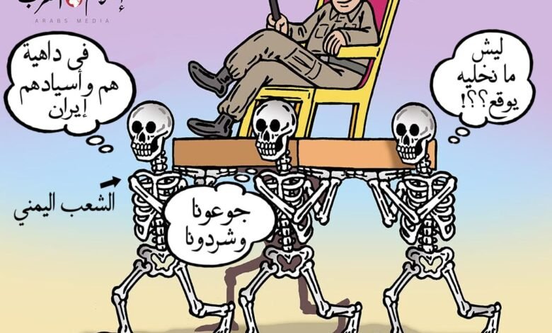 صرخة يمنية تختصر المشهد: هذا الكاريكاتير المؤلم يجسد واقع معاناة الشعب اليمني الذي يرزح تحت وطأة جماعة الحوثي، مُجوَّعًا ومُشرَّدًا، بينما الجماعة تجلس متربعة على عرش القهر بدعم أسيادها في إيران.المشهد يتحدث عن نفسه: هياكل عظمية تمثل الشعب المنهك، تتساءل عن سبب استمرار هذا العبء. رسالة واضحة لكل من يعنيه الأمر: كفى ظلمًا وتبعا!