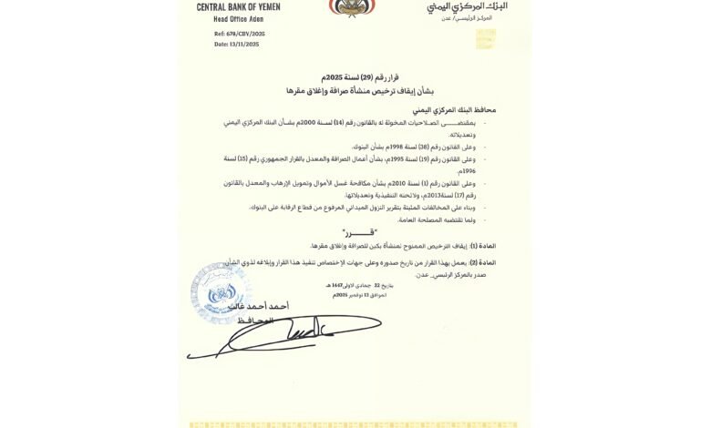 وجاء في القرار رقم (29) لسنة 2025م الذي حصل”[اسم البعث نيوز]” على نسخة منه، أن القرار الصادر بتاريخ 13 نوفمبر 2025م يأتي “بناء على المخالفات المثبتة بتقرير النزول الميداني المرفوع من قطاع الرقابة على البنوك، ولما تقتضيه المصلحة العامة”.