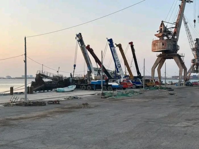 عدن.. انتشال أكبر سفينة غارقة بوزن 1100 طن من حوض ميناء الاصطياد