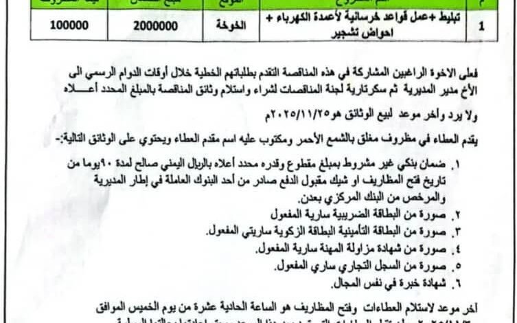 أعلنت السلطة المحلية بمحافظة الحديدة عن إنزال المناقصة العامة رقم (1) للعام 2025م الخاصة بتنفيذ مشروع تبليط الجزر الوسطية للشارع العام الممتد من جولة السفينة حتى جولة حيس بمدينة الخوخة، إضافة إلى إنشاء قواعد خرسانية لأعمدة الإنارة وإنشاء أحواض تشجير على طول الخط الرئيسي