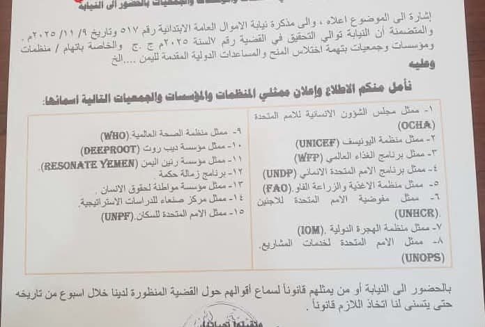في تطور جديد ضمن جهود مكافحة الفساد، أصدرت النيابة العامة في محافظة مأرب مذكرة رسمية تستدعي فيها 15 منظمة دولية وعدداً من شركائهم للحضور أمامها، وذلك في إطار القضية المنظورة الخاصة بفساد التمويلات.
