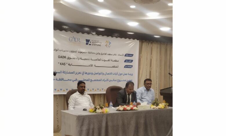 تحت شعار “تمكين المجتمع لبناء المستقبل”، عُقدت اليوم بمدينة سيئون، العاصمة الإدارية لمحافظة حضرموت الساحل، ورشة عمل نوعية حول “آليات الاتصال والتواصل ودورها في تعزيز المشاركة المجتمعية”، وذلك ضمن مشروع تمكين أفراد المجتمع المحلي الذي تنفذه منظمة الغوث العالمية للتنمية والحقوق (GADR) بالشراكة مع مؤسسة “KAS” الألمانية