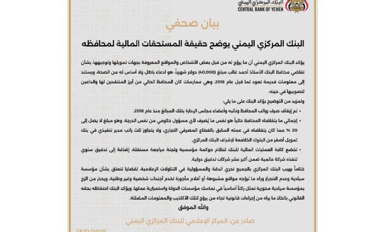 في ردٍّ حاسم على ما أسماه “ادعاءات باطلة”، أصدر البنك المركزي اليمني اليوم بياناً مفصلاً نفى فيه بشكل قاطع ما تردد في بعض الوسائل الإعلامية ومواقع التواصل الاجتماعي حول صرف مبالغ مالية ضخمة لمحافظ البنك