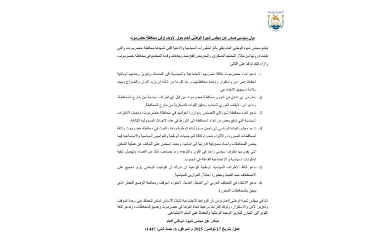 وذكر في بنوده الأولى، دعوة المجلس أبناء حضرموت من مختلف المشارب إلى “التلاحم وتعزيز الوحدة الوطنية” ونبذ كل ما من شأنه تأجيج الصراع وتهديد النسيج الاجتماعي. كما حذّر البيان صراحةً من “أي تدخل في شؤون محافظة حضرموت من قبل أي أطراف سياسية من خارج المحافظة”، مُطالبًا بـ “الإيقاف الفوري للتحشيد وتدفق القوات العسكرية” نحوه
