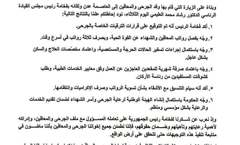 وإذ نعرب عن شكرنا لفخامة رئيس الجمهورية على تعامله المسؤول مع ملف الجرحى والمعاقين، وإدراكه لأهمية رعايتهم وتأهيلهم وضمان حقوقهم، فإننا نطمئن جميع إخواننا بأننا ماضون في متابعة تنفيذ هذه التوجيهات حتى تتحقق على أرض الواقع.