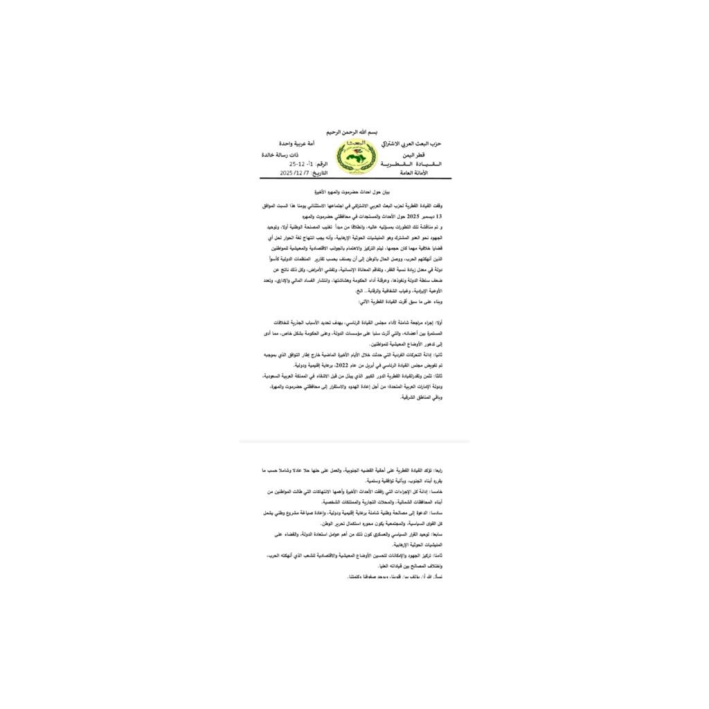 أصدرت القيادة القطرية لحزب البعث العربي الاشتراكي ، بياناً مفصلاً يوم الخميس الماضي ، تناولت فيه التطورات الأخيرة في محافظتي حضرموت والمهرة، داعيةً إلى توحيد الصفوف واعتماد لغة الحوار وتركيز الجهود نحو “العدو المشترك”
