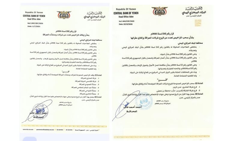 أصدر البنك المركزي اليمني في عدن قرارين رقابيين جديدين بسحب وإيقاف تراخيص عدد من شركات ومنشآت الصراقة، وذلك في إطار تعزيز الرقابة على القطاع المالي ومكافحة الممارسات المخالفة للقوانين النافذة.
