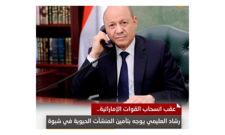 فخامة رئيس مجلس القيادة يوجه بتأمين المنشآت الحيوية في شبوة عقب انسحاب قوات الإمارات..