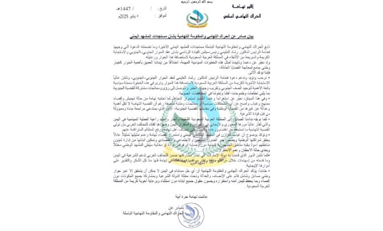 ▪️ ختاماً، يؤكد الحراك التهامي والمقاومة التهامية أن أي حل مستدام في اليمن لا يمكن أن يتحقق إلا عبر حوار وطني صادق وشامل قائم على الإنصاف والعدالة وتحت مظلة الدولة الشرعية وبمشاركة جميع المكونات دون إقصاء وبما يحفظ لليمن أمنه واستقراره ويصون حقوق جميع أبنائه دون استثناء وبرعاية أخوية كريمة من المملكة العربية السعودية.