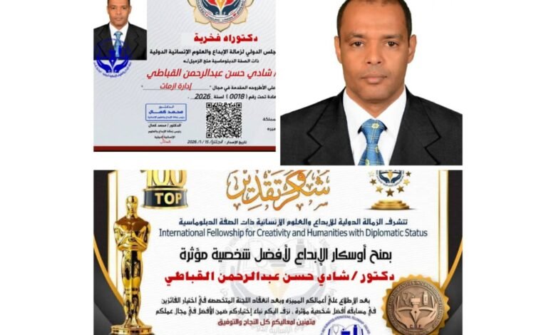 ويأتي هذا التكريم من المجلس الدولي للزمالة نظير الإسهامات العلمية والبحثية البارزة التي قدّمها الدكتور شادي القباطي في مجال تخصصه، وما تمثله من قيمة معرفية وعلمية على المستويين الأكاديمي والبحثي.