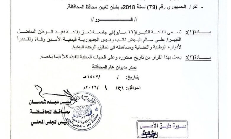 وجاء في القرار رقم (19) لسنة 2026م، أن التسمية تأتي “وفاء وتقديراً لأدواره الوطنية والنضالية ومساهمته في تحقيق الوحدة اليمنية”، وذلك اعتباراً من تاريخ صدور القرار.