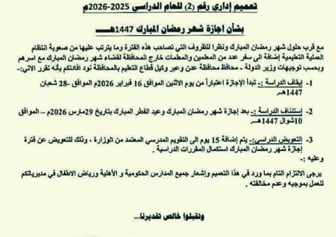 أصدر مكتب التربية والتعليم بالعاصمة المؤقتة عدن تعميمًا إداريًا بشأن إجازة شهر رمضان المبارك للعام الدراسي 2025–2026م.