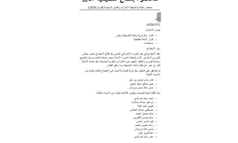 تنسيقية الأحزاب اليمنية تعقد اجتماعها الأول بالمكلا وتُشكل سكرتارية ولجنة لوضع اللائحة التنظيمية