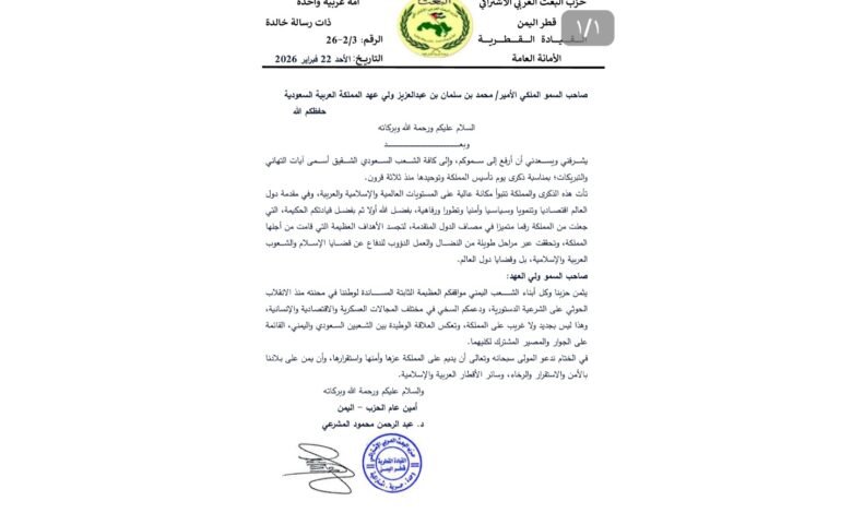 الأمين العام لحزب البعث العربي الاشتراكي (قطر اليمن يرفع التهنئة لخادم الحرمين الشريفين وولي عهده بذكرى يوم تأسيس المملكة العربية السعودية