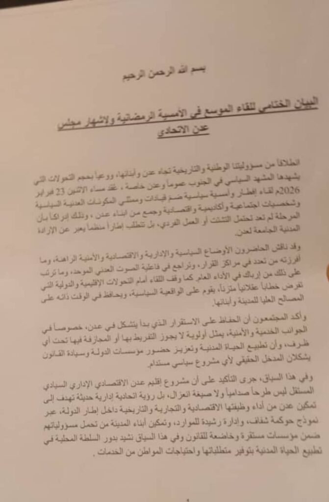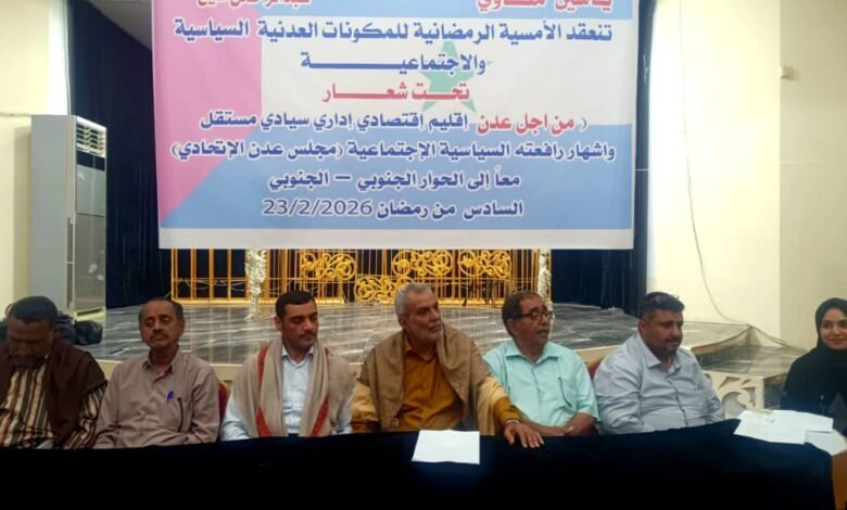 انطلاقاً من مسؤوليتنا الوطنية والتاريخية تجاه عدن وأبنائها، ووعياً بحجم التحولات التي يشهدها المشهد السياسي في الجنوب عموماً وعدن خاصة ، عُقد مساء الاثنين 23 فبراير 2026م لقاء إفطار وأمسية سياسية ضمّ قيادات وممثلي المكونات العدنية السياسية وشخصيات اجتماعية وأكاديمية واقتصادية وجمع من ابناء عدن ، وذلك إدراكاً بأن المرحلة لم تعد تحتمل التشتت أو العمل الفردي، بل تتطلب إطاراً منظماً يعبر عن الإرادة المدنية الجامعة لعدن.