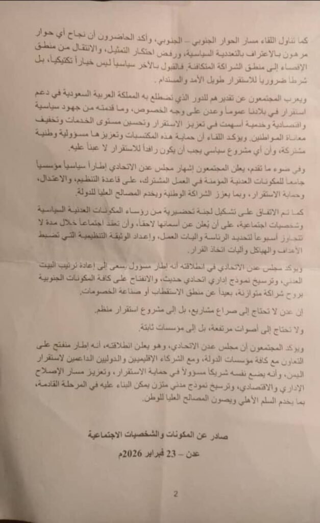 ويعرب المجتمعون عن تقديرهم للدور الذي تضطلع به المملكة العربية السعودية في دعم استقرار في بلادنا عموماً وعدن على وجه الخصوص، وما قدمته من جهود سياسية واقتصادية وخدمية أسهمت في تعزيز الاستقرار وتحسين مستوى الخدمات وتخفيف معاناة المواطنين. ويؤكد اللقاء أن حماية هذه المكتسبات وتعزيزها مسؤولية وطنية مشتركة، وأن أي مشروع سياسي يجب أن يكون رافداً للاستقرار لا عبئاً عليه.