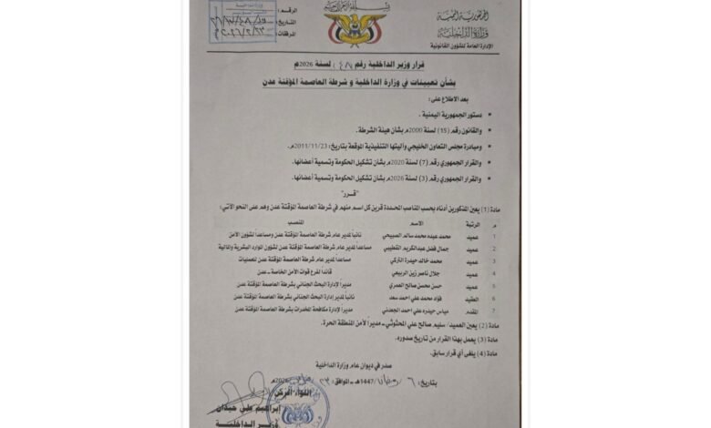 وأكد القرار، الصادر بناءً على أحكام الدستور والقانون رقم (15) لسنة 2000م بشأن هيئة الشرطة، وعلى مبادرة مجلس التعاون الخليجي وآليتها التنفيذية، وعلى القرارين الجمهوريين رقم (7) لسنة 2020م ورقم (3) لسنة 2026م بشأن تشكيل الحكومة، أن هذه التعيينات تهدف إلى تعزيز الأداء الأمني في العاصمة المؤقتة عدن.