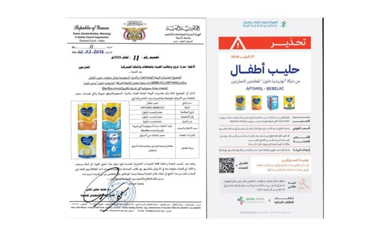 اصدرت الهيئة اليمنية للمواصفات والمقاييس وضبط الجودة اليوم الاثنين الموافق 2 مارس 2026م، تعميم برقم (11) لعام 2026م بشأن التحذيرات الصادرة عن الهيئة العامة للغذاء والدواء السعودية بخصوص سحب علامات تجارية لمنتجات حليب اطفال ملوثة .